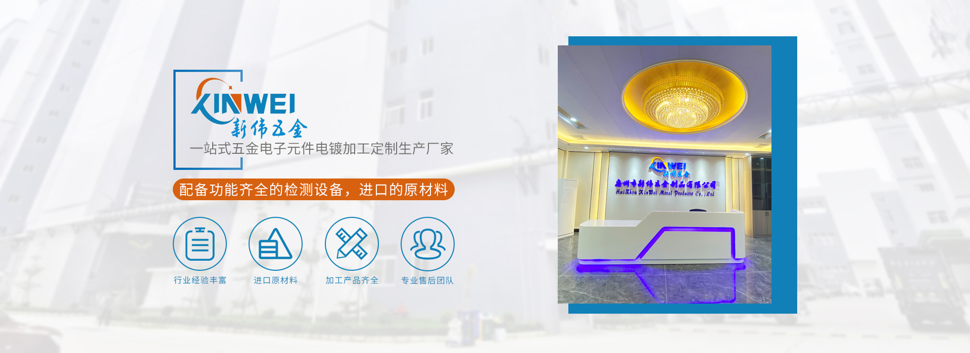 惠州市新偉五金制品有限公司(簡稱:新偉五金)坐落于中國廣東省惠州市,成立于2010年,是一家專業電鍍各種高品質功能性的環保五金電子元件供應商,公司已通過ISO9001:2015及IATF16949:2016質量體系認證??蛻糁辽希焚|至上,承蒙新老客戶的信賴,公司發展迅速,廠房車間面積10000平方米,現有員工200名,并擁有一批從事電鍍行業10年以上、經驗豐富的技術骨干,為客戶解決許多疑難問題,另有一支品質工程小組,專業檢測產品品質,杜絕不良品外流,深受客戶好評。